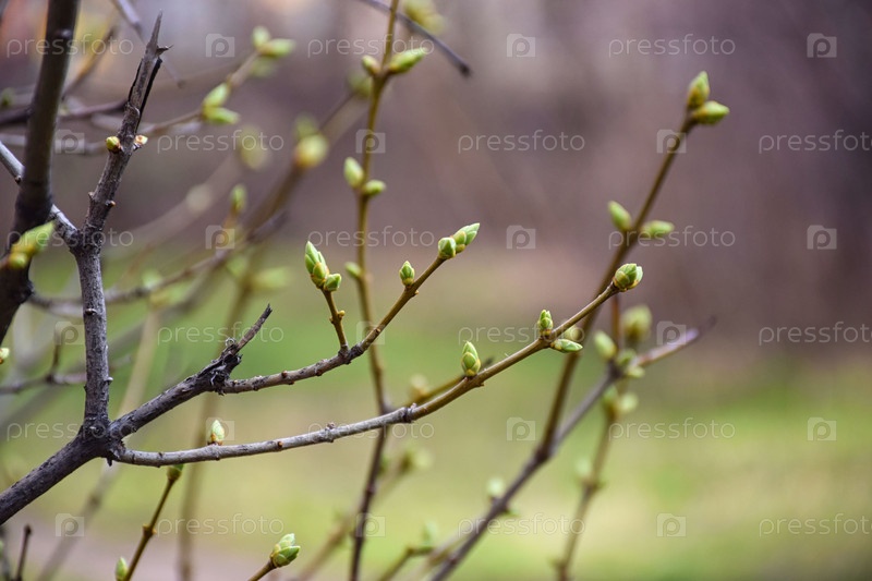 Молодые зеленые почки начинают распускаться на тонких ветвях весной. Рост природы, весенний сезон, жизнь растений