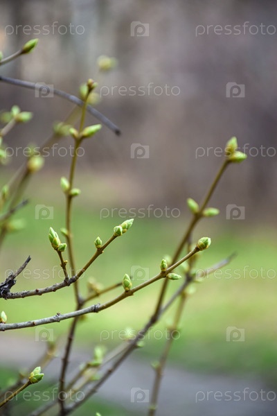 Молодые зеленые почки начинают распускаться на тонких ветвях весной. Рост природы, весенний сезон, жизнь растений