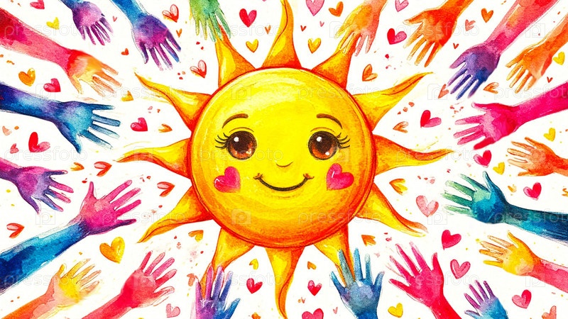 Веселое улыбающееся солнышко в мультяшном стиле на белом фоне — позитивный символ радости и тепла. Детский рисунок солнце. Руки тянутся к солнцу