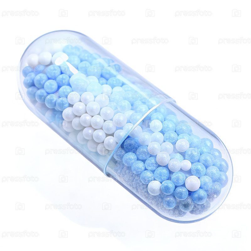Синяя и белая капсула таблеток, наполненная различными бисерами, лежащими на простом фоне