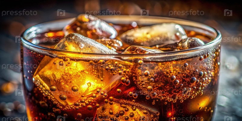 Освежающий газированный напиток с льдом в стакане, захватывающий бурение и богатый цвет на темном фоне