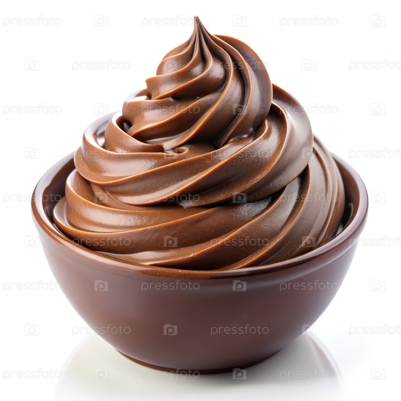 Декадентный шоколадный крем красиво кружится в коричневой миске на нетронутом белом фоне, идеально подходит для любителей десертов и кулинарных энтузиастов