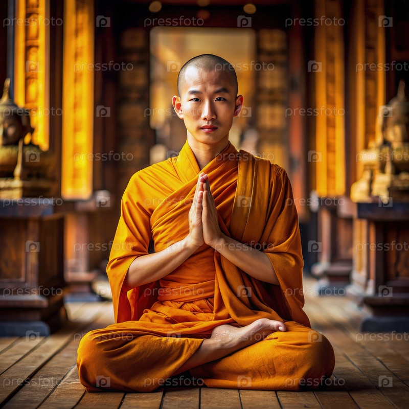 Красивый азиатский монах в позе медитации, окруженный спокойной обстановкой храма