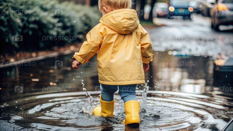 Ребенок в желтом плаще и подходящих ботинках радостно брызгает через лужу в дождливый день в парке