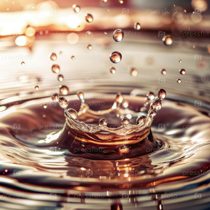 Капли воды брызгут по поверхности с кольцами, образующимися в солнечном свете