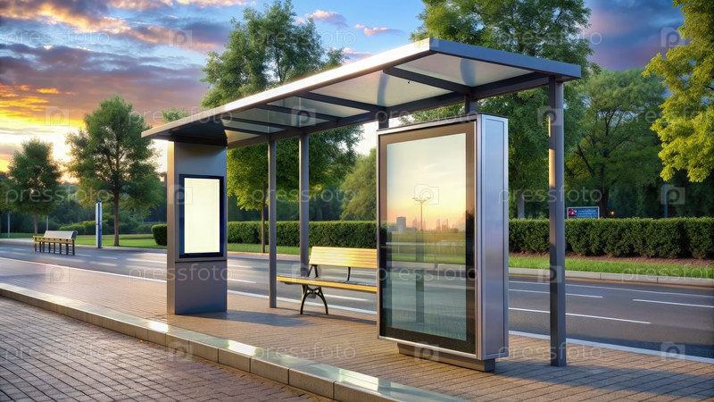 Современная автобусная остановка с цифровым киоском и скамейкой в спокойной городской локации во время заката, демонстрирующая яркие цвета и мирную обстановку