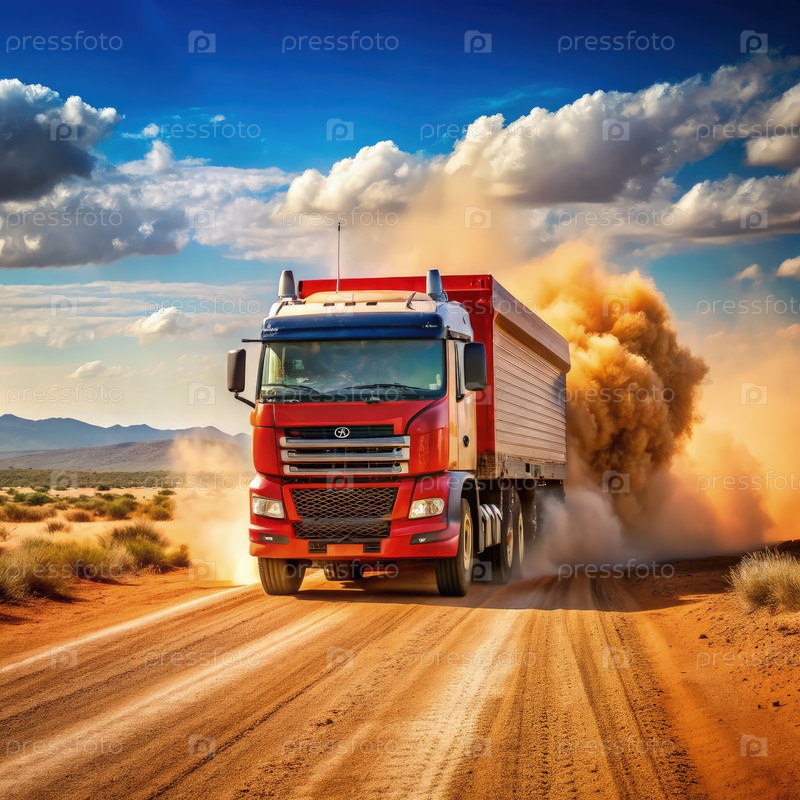 Красно-белый грузовик едет по пыльной грунтовой дороге через живописный пейзаж под ярким голубым небом с облаками