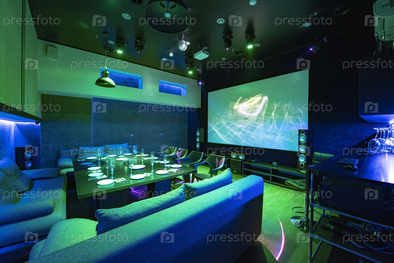 Интерьер гостиной с домашним кинотеатром в современной квартире