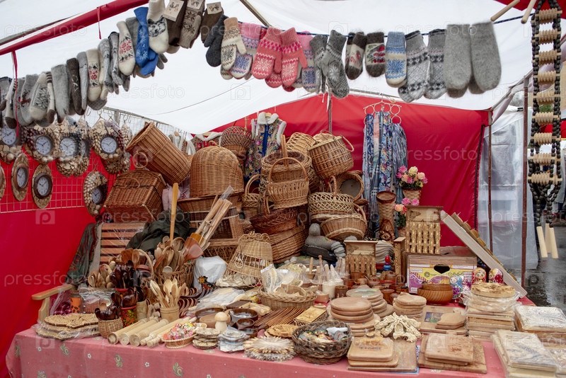 Лоток с традиционными русскими изелиями на рынке. Москва