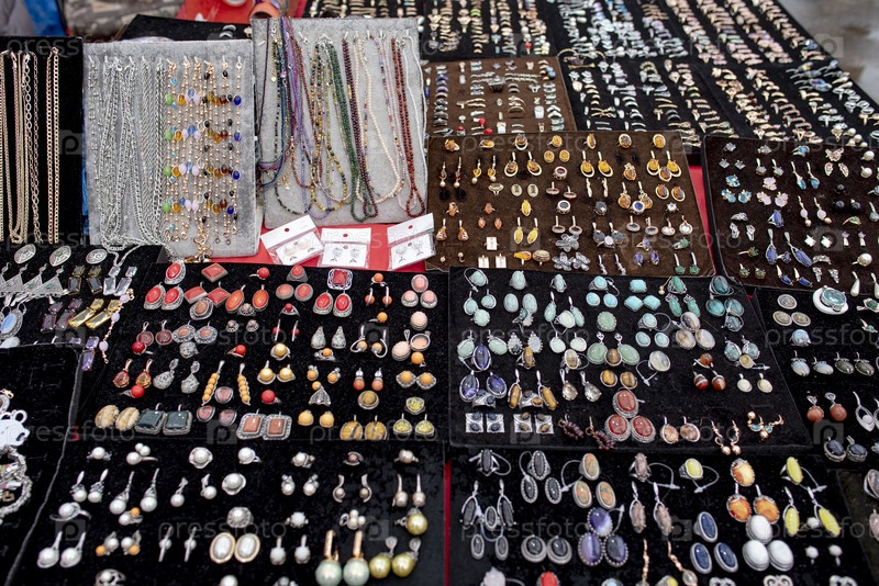 Лоток с традиционными русскими сувенирами на рынке. Москва