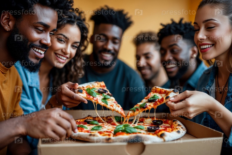 Генеративная ИИ Большая группа друзей семья ест итальянскую кухню и празднует Национальный день пиццы