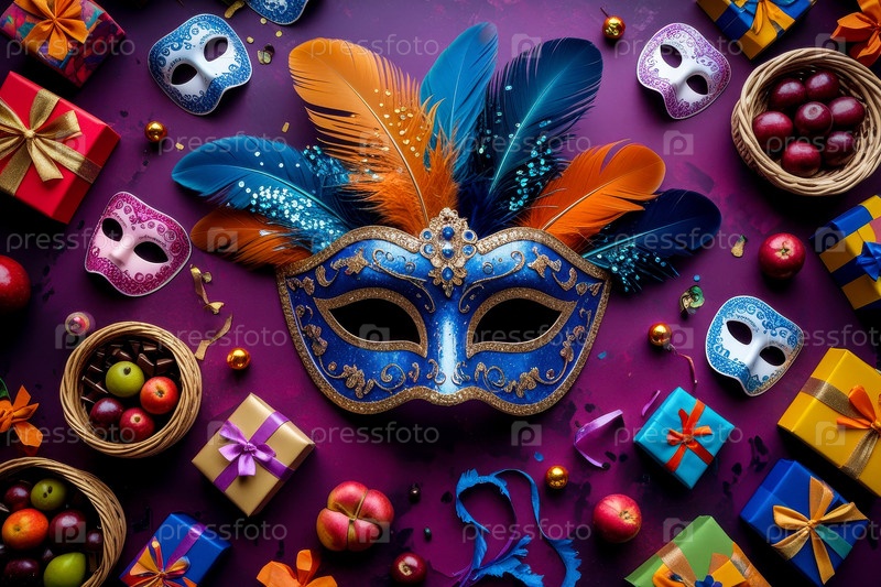 Красочные карнавальные маски, празднование еврейских традиций Фестиваль Пурима Парад фоновый AI генеративный