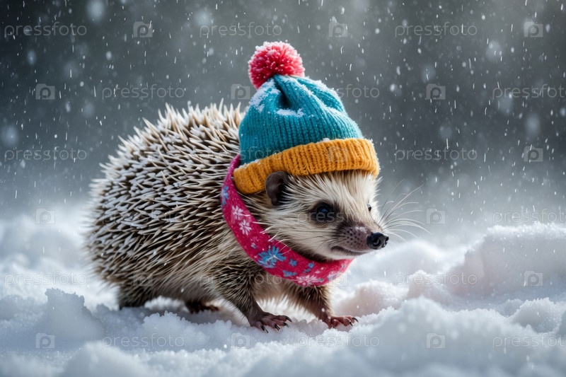 AI Generative Портрет ежи в вязанной зимней одежде шляпе и шарфе, животное во снежном снегу зимой