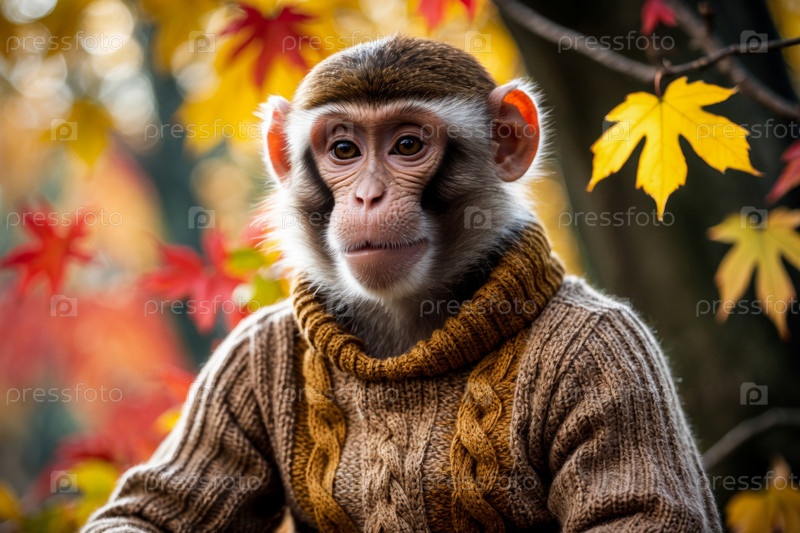 Обезьяна в трикотажном свитере осенний лесный фон, животное в красно-желтых листьях AI Generative