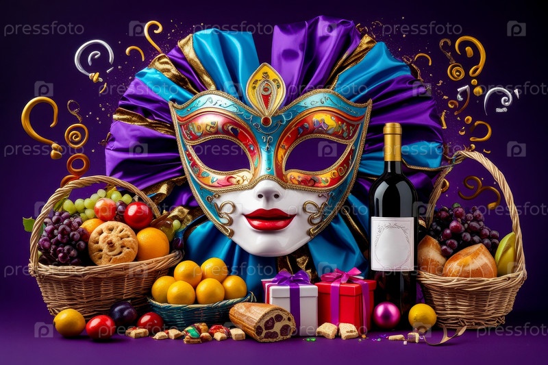 Красочные карнавальные маски, празднование еврейских традиций Фестиваль Пурима Парад фоновый AI генеративный