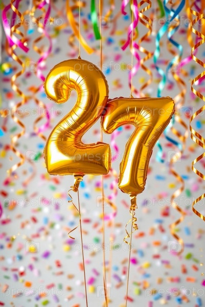 Гелийный день рождения шарик формы номер двадцать семь, золотая буква фигура 27 праздник праздничный фон