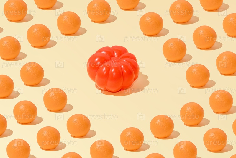 Творческий абстрактный летний оранжевый и томатный рисунок плоского уклада на пастельно-желтом фоне минимализма
