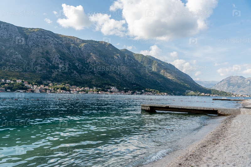 Пустой осенний тихий пляж в городе Котор на Черногории, залив Бока в Адриатическом море