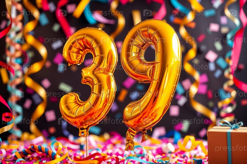 Гелиевый день рождения воздушный шар номер тридцать девятый, фигура из золотых букв 39 праздник праздничный фон