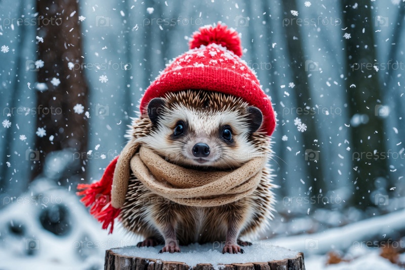 AI Generative Портрет ежи в вязанной зимней одежде шляпе и шарфе, животное во снежном снегу зимой