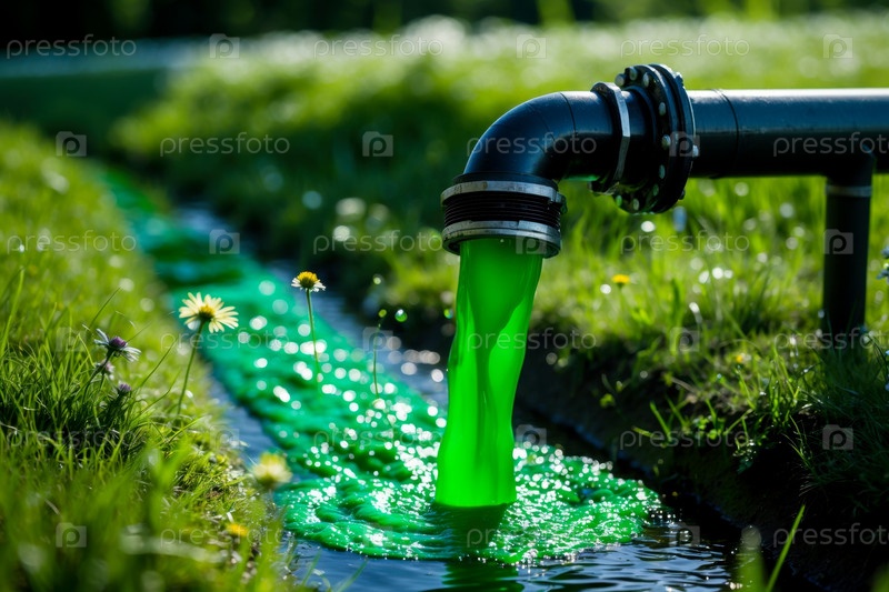 ИИ генеративная сточная вода течет из трубы в водоем, загрязняя экосистему морских морей океанов и рек