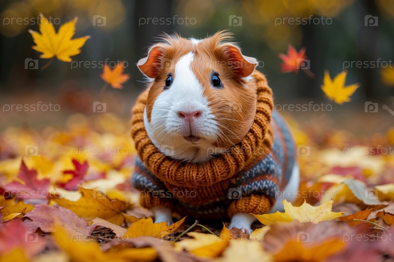 ИИ генеративная морская свинка в трикотажном свитере на осеннем лесном фоне, животное в красных и желтых листьях