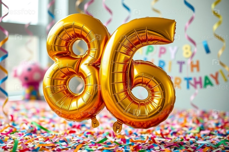 Гелийный баллон на день рождения номер восемьдесят шесть, фигура из золотых букв 86 праздник праздничный фон