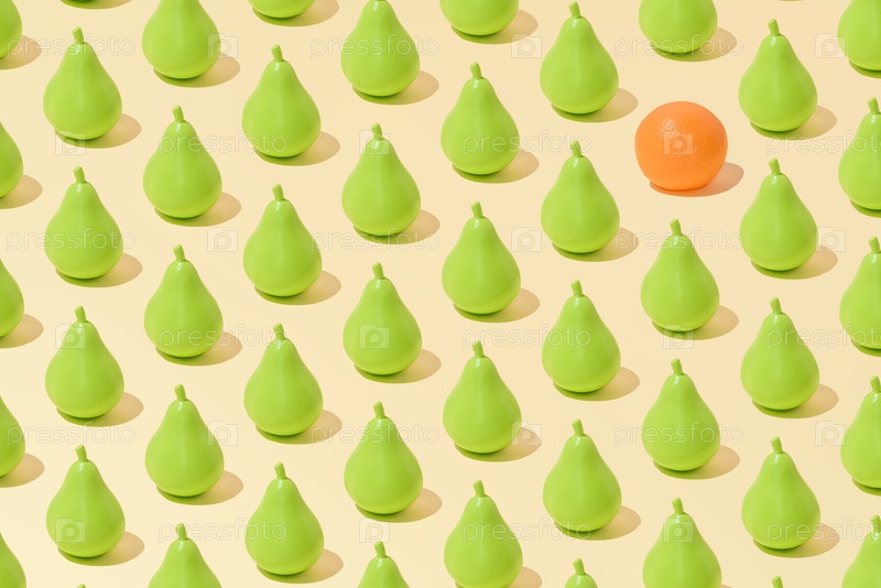 Креативная абстрактная груша и оранжевый рисунок плоский лежит на пастельно-желтом фоне