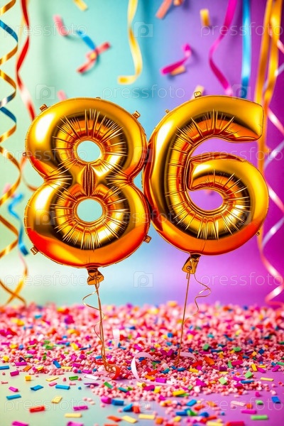 Гелийный баллон на день рождения номер восемьдесят шесть, фигура из золотых букв 86 праздник праздничный фон