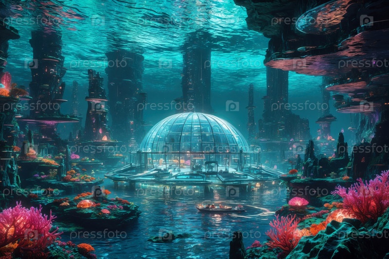 Генеративный футуризм урбанистический городской пейзаж, кибер подводный город Атлантида ИИ панорама будущее здания