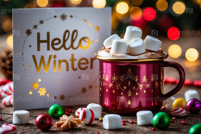 Надпись на баннере поздравительной открытки Здравствуйте, зимний фон кружка какао и конфеты AI Generative