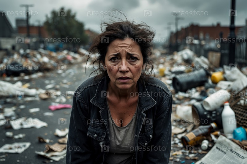 AI Generative Загрязнение окружающей среды городской придорожной улицы, женщина ходит среди мусора мусорный мешок свалка полигон на захоронении в городе
