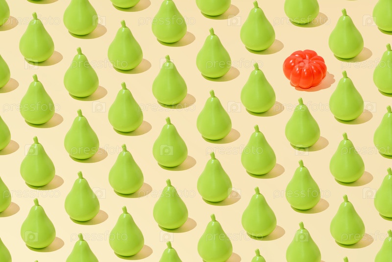 Творческий абстрактный летний груша и томатный рисунок плоский лежит на пастельно-желтом фоне минимализма
