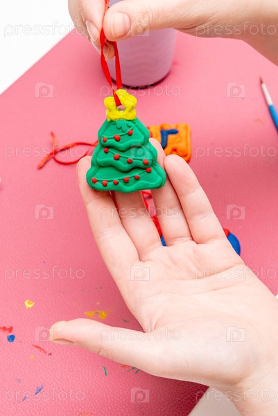Женщина держит в руке и показывает DIY ручной работы гипсовой игрушки Рождественская елка, окрашенная цветной краской