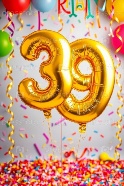 Гелиевый день рождения воздушный шар формы номер тридцать девять, фигура золотой буквы 39 празднование праздничное фоновое оформление