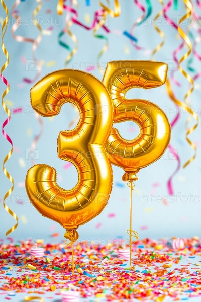 Гелиевый баллон на день рождения номер тридцать пять, фигура из золотых букв 35 праздник праздничный фон