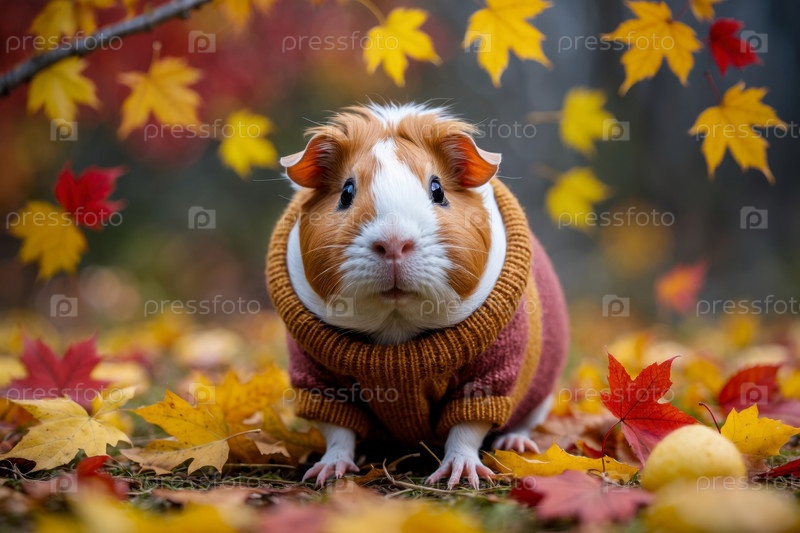 Гвинейская свинка вязаный свитер осенний лесной фон, животное в красно-желтых листьях AI Generative
