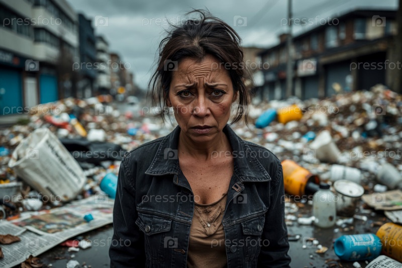 AI Generative Загрязнение окружающей среды городской придорожной улицы, женщина ходит среди мусора мусорный мешок свалка полигон на захоронении в городе