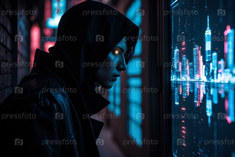 Generative Man AI гуманоидный футуристический человек, человек на будущем научно-фантастическом завтрашнем городском фоне
