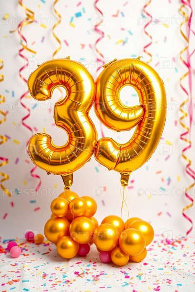 Гелиевый день рождения воздушный шар формы номер тридцать девять, фигура золотой буквы 39 празднование праздничное фоновое оформление