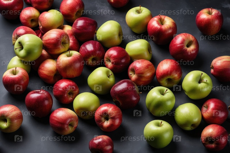 AI Generative Flat lay pattern of ripe apple fruits, top view on summer organic fresh background (Генеративный образец плоского слоя спелых яблочных фруктов, верхний вид на летнем органическом свежем фоне)