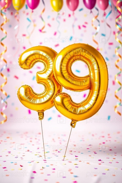 Гелиевый день рождения воздушный шар формы номер тридцать девять, фигура золотой буквы 39 празднование праздничное фоновое оформление