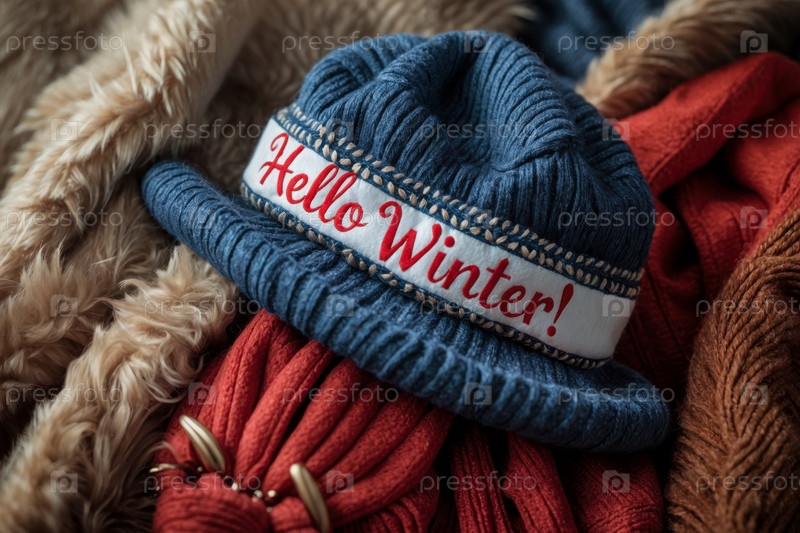 Надпись на баннере поздравительной открытки Здравствуйте, зима на фоне вязанных свитеров шляп AI Generative