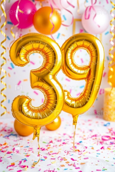 Гелиевый день рождения воздушный шар формы номер тридцать девять, фигура золотой буквы 39 празднование праздничное фоновое оформление