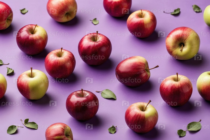 AI Generative Flat lay pattern of ripe apple fruits, top view on summer organic fresh background (Генеративный образец плоского слоя спелых яблочных фруктов, верхний вид на летнем органическом свежем фоне)