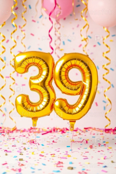 Гелиевый день рождения воздушный шар формы номер тридцать девять, фигура золотой буквы 39 празднование праздничное фоновое оформление