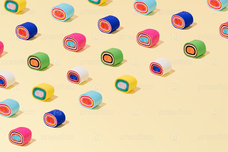 Творческий абстрактный рисунок суши-ролл с плоским лаком на пастельном желтом фоне copyspace