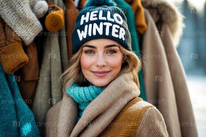Надпись на баннере поздравительной открытки Здравствуйте, зимняя молодая женщина в вязанном свитере и шляпе AI Generative