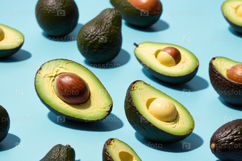 Flat lay pattern of ripe avocado vegetable top view on summer organic fresh background AI Generative Плоский укладный рисунок спелого овоща авокадо верхний вид на лето органический свежий фон ИИ генеративная