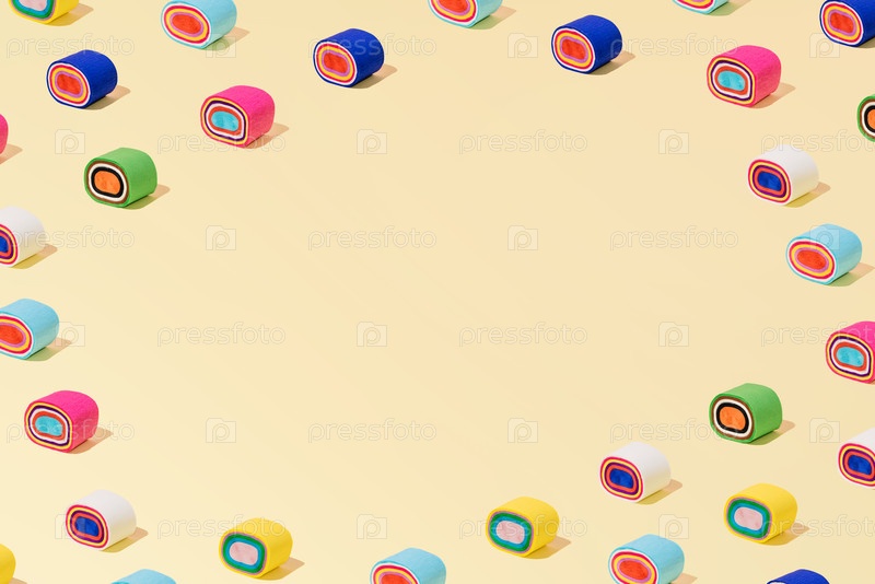 Творческий абстрактный рисунок рулонов суши плоский лежит на пастельно-желтом фоне минимализм с копировальным пространством
